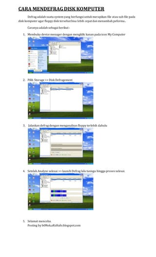 Defrag adalah sistem yang merapikan file pada disk komputer untuk meningkatkan kecepatan dan performa. Proses defragmentasi melibatkan beberapa langkah, termasuk membuka Device Manager dan menganalisis floppy disk sebelum menjalankan defrag. Setelah proses selesai, pengguna dapat menikmati kinerja yang lebih baik dari disk.
