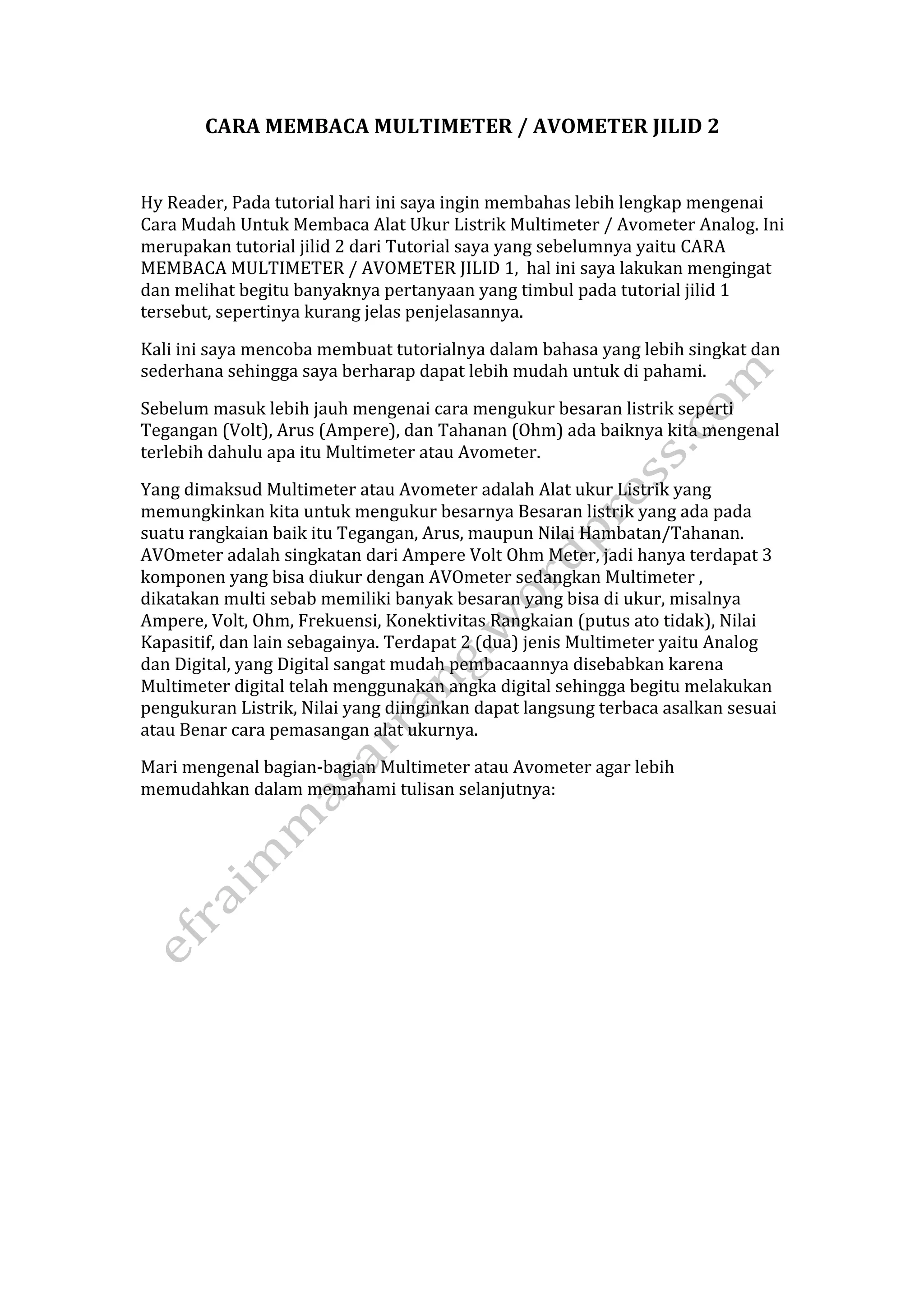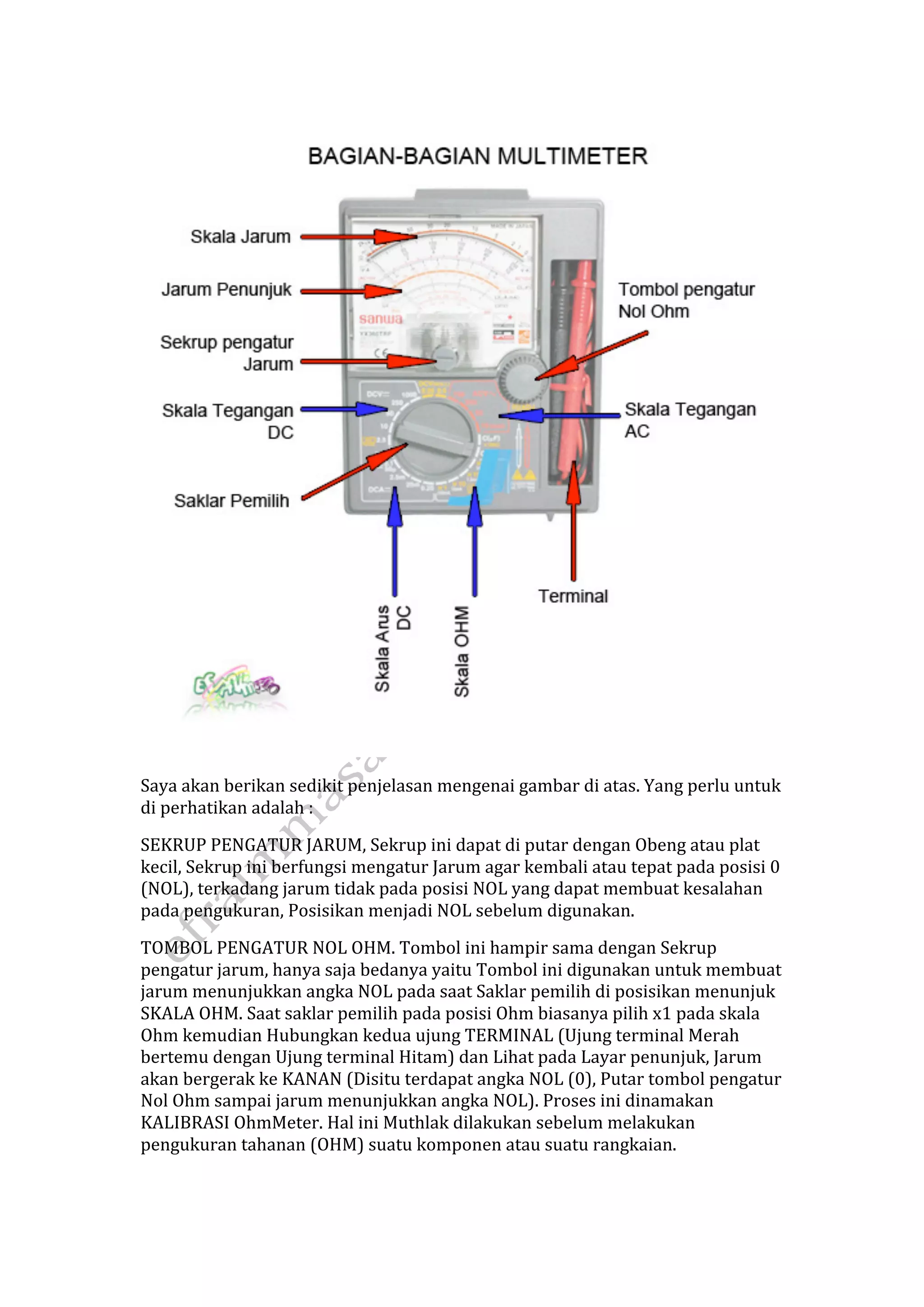 Dokumen tersebut memberikan penjelasan lengkap tentang cara membaca alat ukur listrik multimeter secara analog. Dijelaskan bagian-bagian penting multimeter beserta fungsinya dan cara pemasangan yang benar ketika mengukur tegangan, arus, dan hambatan. Juga dijelaskan cara membaca nilai yang diukur dengan memilih skala pengukuran yang tepat.