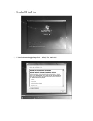 Cara menginstall Windows 7 meliputi persiapan perangkat keras yang mendukung, memasukkan DVD instalasi, mengatur BIOS agar booting dari DVD, memulai proses instalasi, membuat partisi baru untuk menghapus partisi lama jika pernah diinstal sebelumnya, merestart komputer, mengkonfigurasi pengaturan akun pengguna dan lisensi produk, serta menginstal driver-driver perangkat keras.