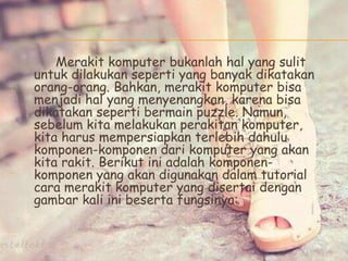 Teks tersebut memberikan panduan lengkap tentang cara merakit komputer dengan menjelaskan komponen-komponen penting yang dibutuhkan beserta fungsinya dan langkah-langkah perakitan secara terperinci.