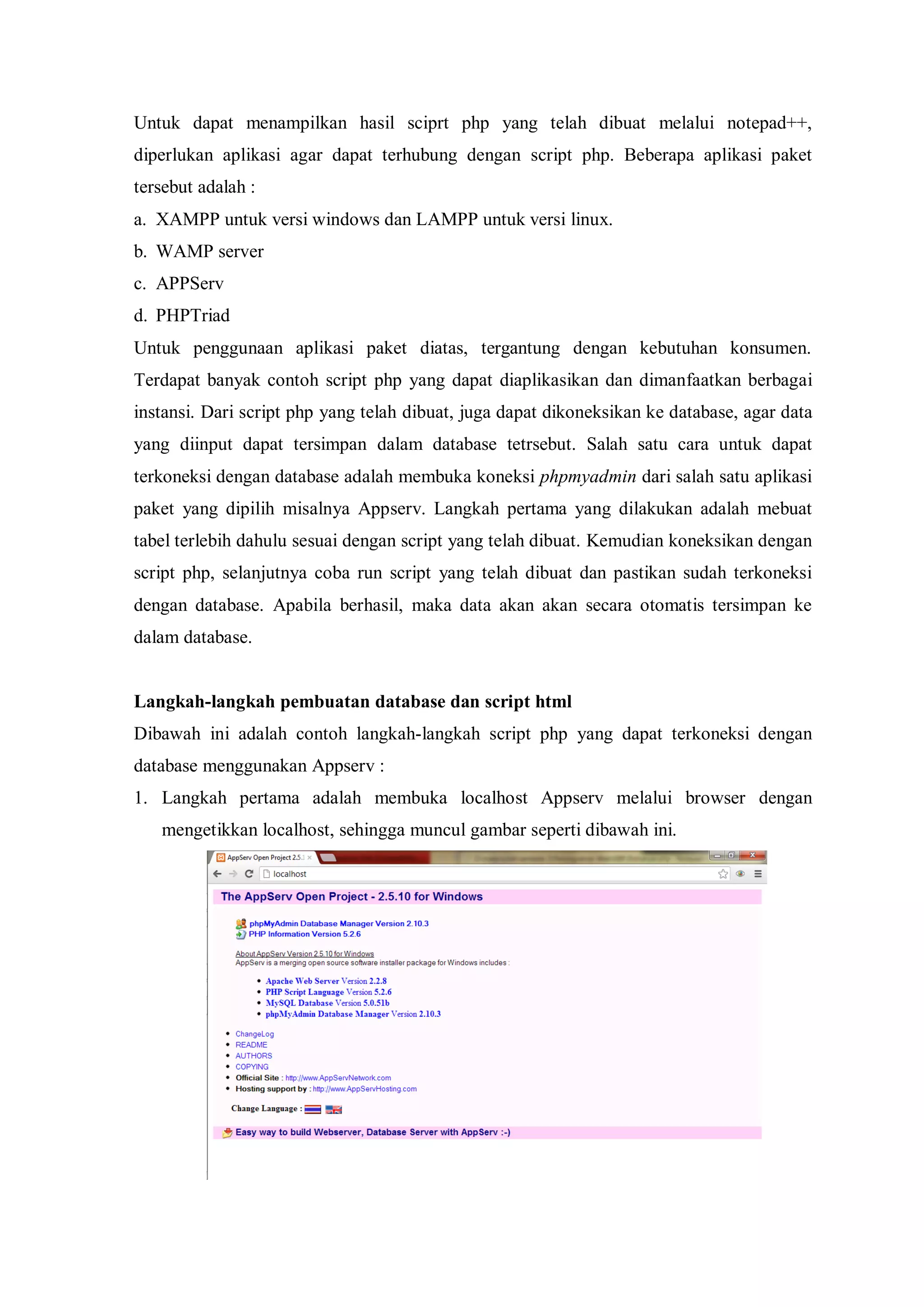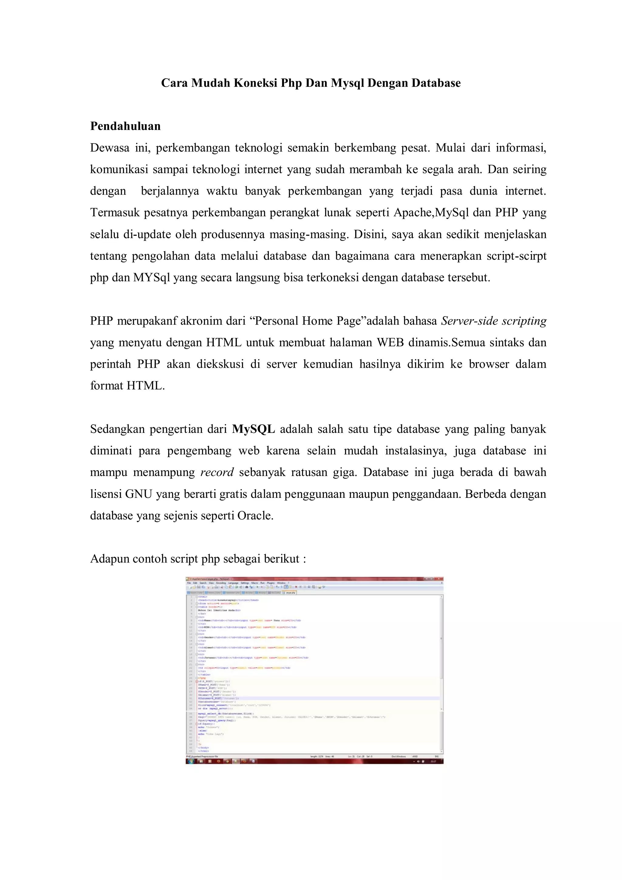 Dokumen ini menjelaskan cara menghubungkan PHP dengan MySQL untuk pengolahan data dalam database. Dengan menggunakan aplikasi seperti XAMPP atau AppServ, pengguna dapat membuat tabel database dan mengelola data melalui skrip PHP. Panduan ini juga mencakup langkah-langkah pembuatan database, pembuatan tabel, dan skrip sederhana untuk menyimpan data.