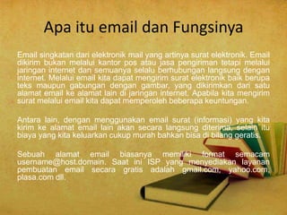 Email adalah surat elektronik yang dikirim melalui jaringan internet, memungkinkan pengiriman cepat dan biaya rendah. Proses pembuatan akun email dapat dilakukan melalui berbagai penyedia layanan gratis seperti Yahoo dan Gmail. Dokumen ini menjelaskan fungsi email serta langkah-langkah untuk membuat akun di Yahoo.
