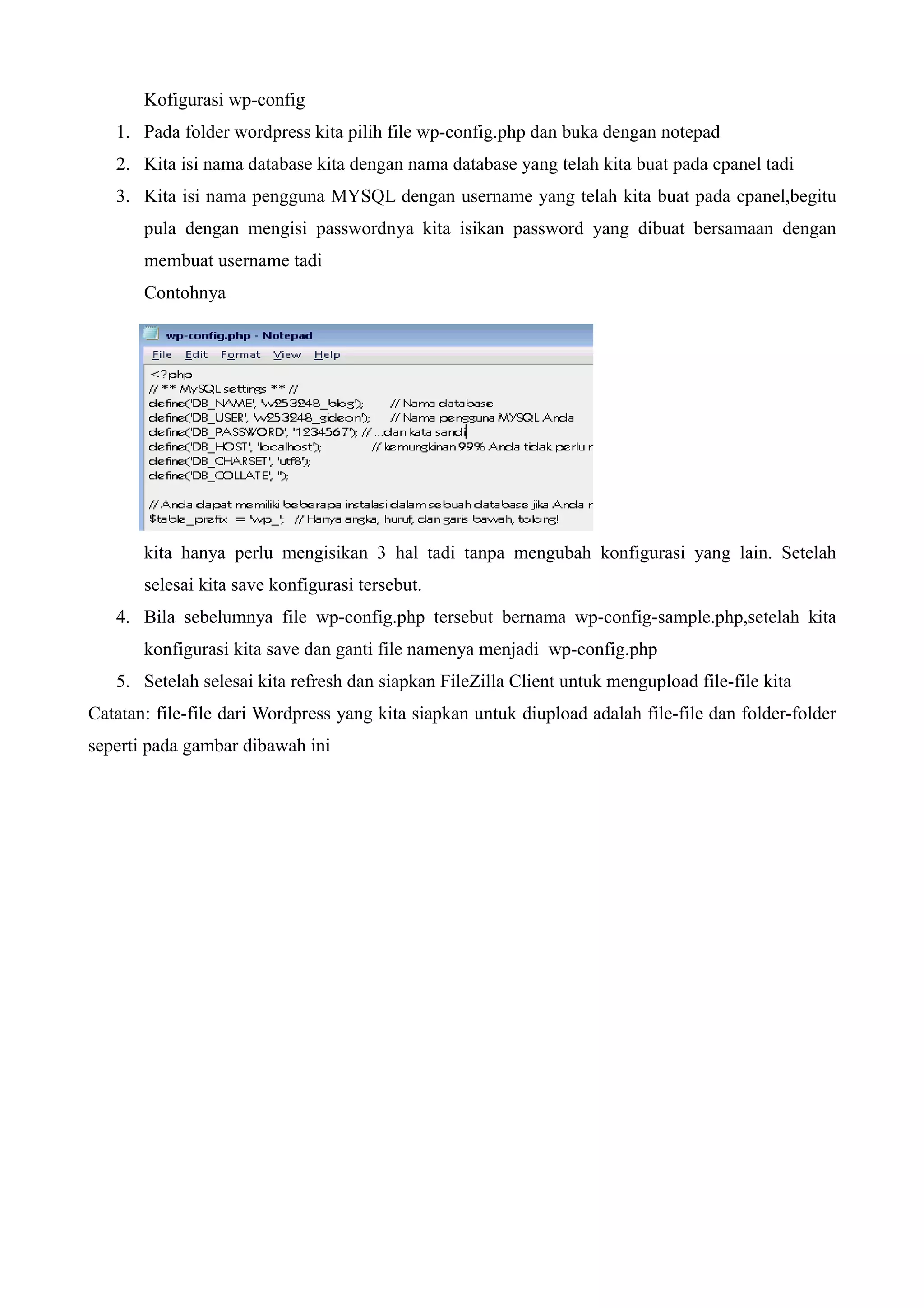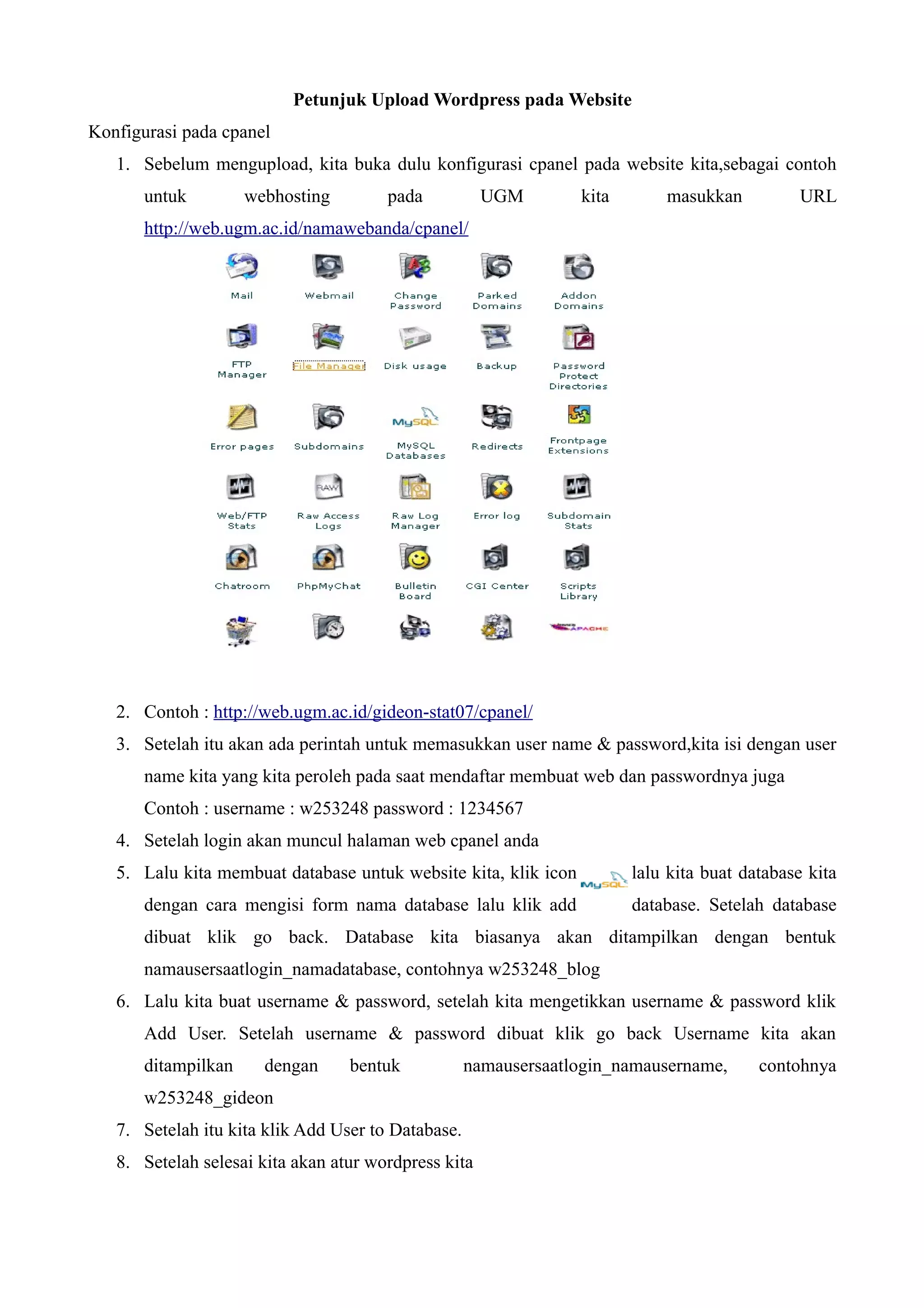 Dokumen ini memberikan panduan langkah demi langkah untuk mengupload website WordPress ke server menggunakan cPanel dan FTP. Selain itu, penjelasan mengenai konfigurasi database dan penggunaan FileZilla sebagai software FTP juga disertakan. Tips tambahan disampaikan untuk memastikan bahwa file dapat ditampilkan dengan benar di website.