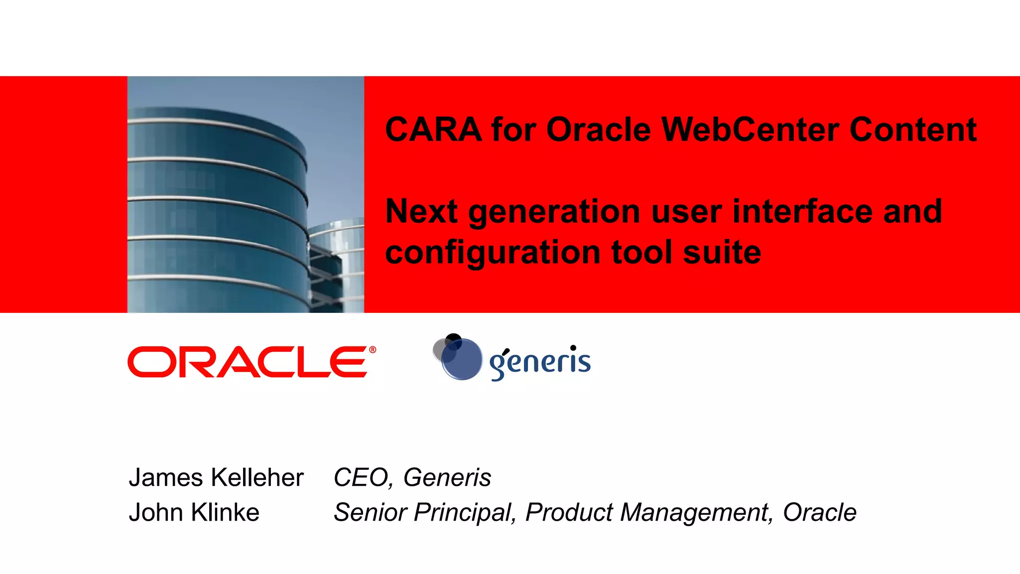 The document discusses CARA, a next generation user interface and configuration tool suite from Generis for Oracle WebCenter Content. It provides an overview of Oracle WebCenter Content and its capabilities for content management. It then describes Generis and CARA, highlighting CARA's fast and customizable user interface and its configuration layer which allows building business use cases without coding. The document concludes by discussing CARA's pre-configured packages that provide template configurations for common use cases to reduce implementation time.