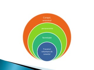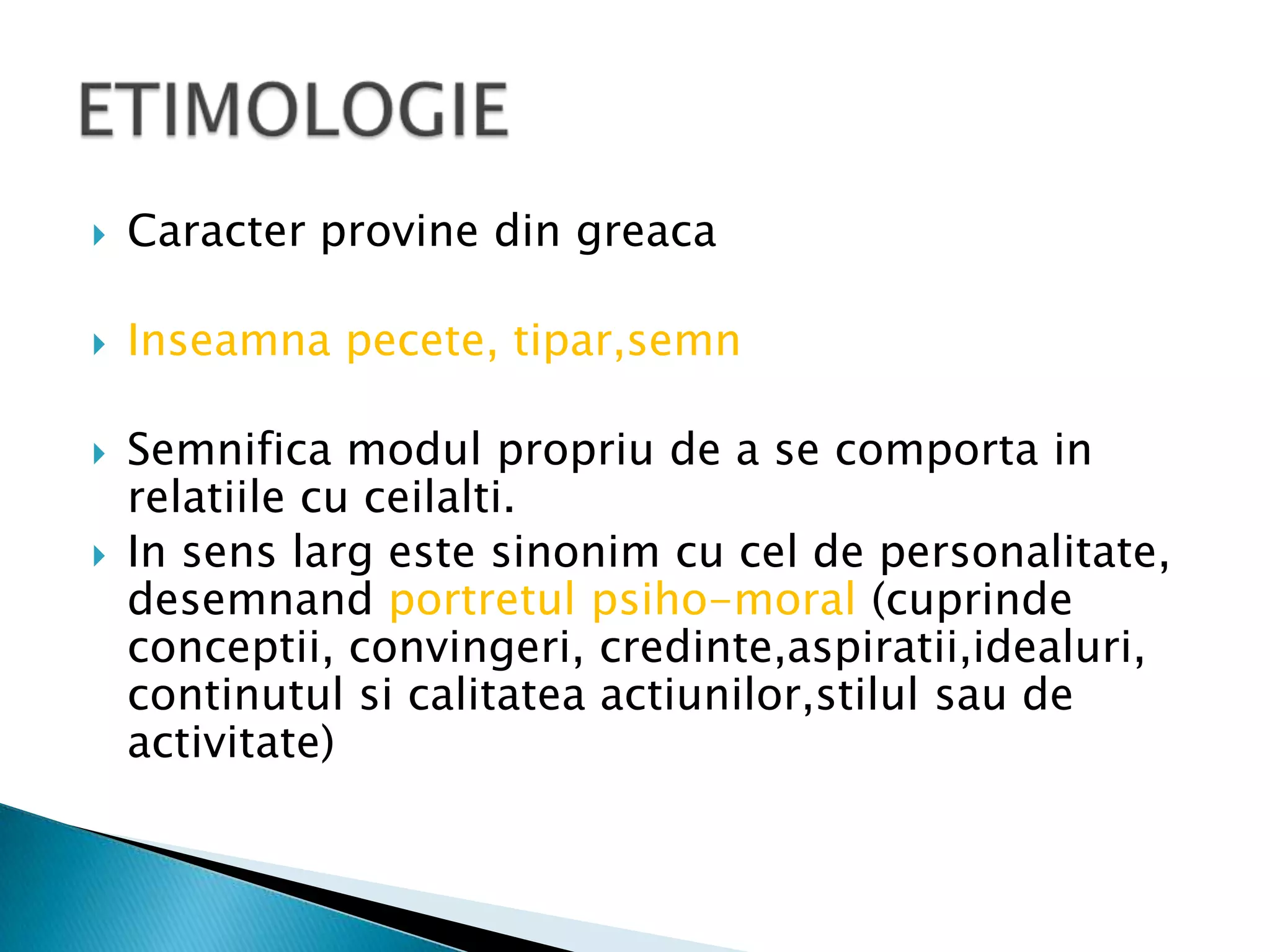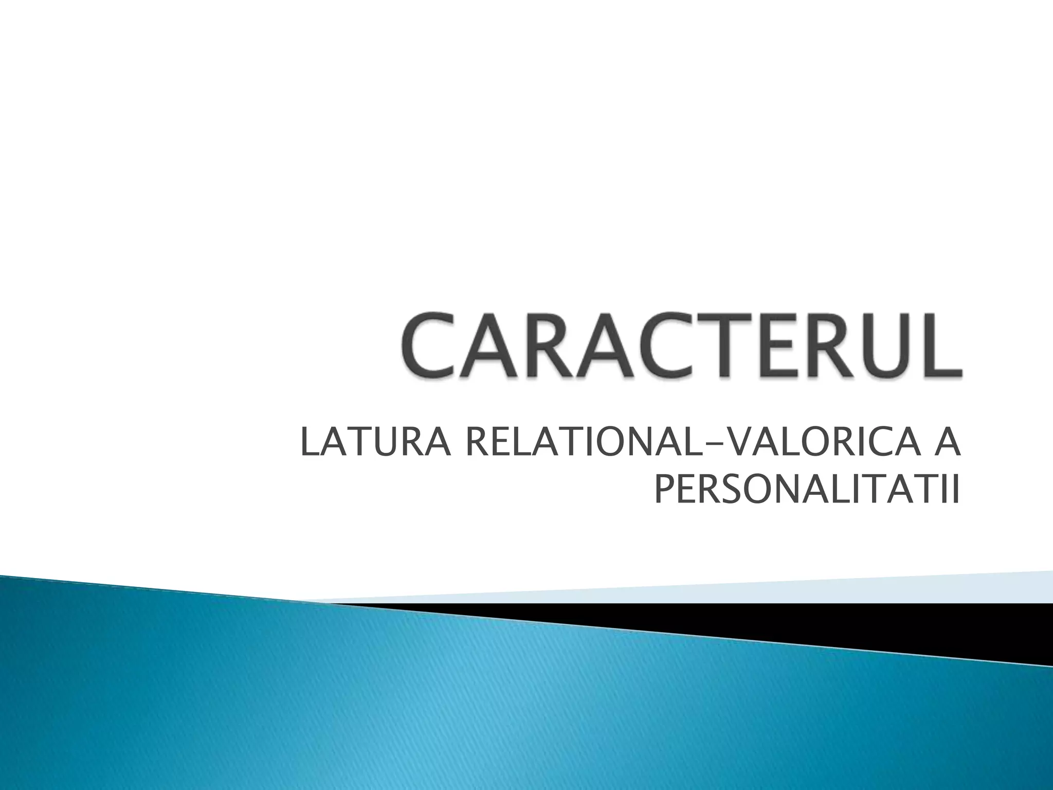 Documentul analizează caracterul ca latură esențială a personalității, provenind din concepte grecești care indică modul de comportament în relațiile sociale. Caracterul este definit prin trăsături psihice stabile și esențiale, care influențează comportamentul uman și interacțiunile sociale. De asemenea, se discută despre interacțiunea caracterului cu temperamentul și aptitudinile, și importanța atitudinii în cadrul acestuia.