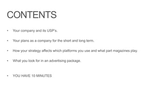 The document presents Carat's vision and strategy for redefining media, emphasizing its innovative approach to create business value through a focus on digital platforms. It outlines key unique selling propositions (USPs) such as global scale, media trading, and a strong customer service ethos, while highlighting the changing media landscape and audience behavior trends. The presentation also discusses the criteria Carat seeks in advertising packages, including creativity, bespoke solutions, and a long-term focus on customer needs.