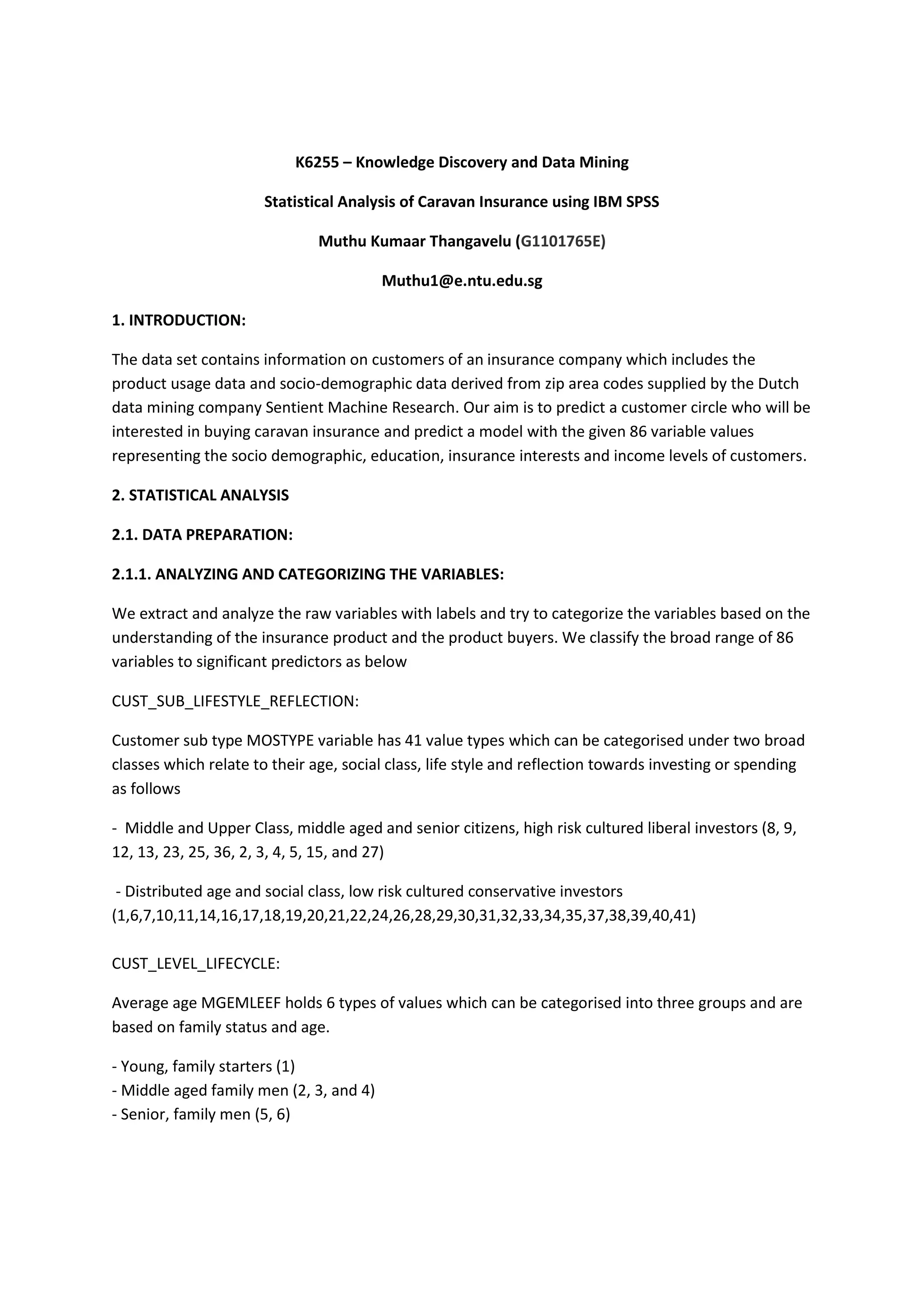 This document provides a statistical analysis of caravan insurance using IBM SPSS. It analyzes a dataset containing 86 variables related to customers of an insurance company. The analysis aims to predict customers interested in caravan insurance and develop a model using the variables. Key steps include: