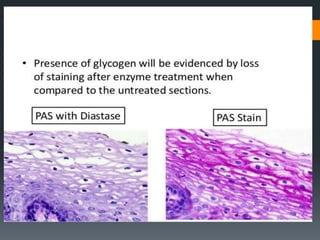 This document provides an overview of carbohydrates, including their classification, structures, functions, and histological staining properties. Carbohydrates are classified as simple carbohydrates or glycoconjugates. Glycogen and mucin are two important carbohydrates for histological analysis. Glycogen stains with PAS, Best's carmine, and other techniques. Mucins include acid and neutral forms that stain differently with Alcian blue, PAS, and other histochemical stains depending on their composition. Carbohydrates play important roles in cellular metabolism and structure.