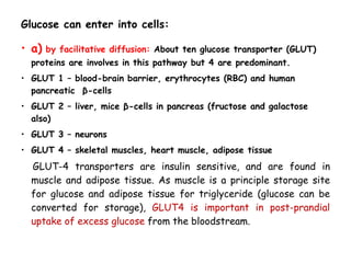 The document details the metabolic pathways of glucose, including its entry into cells via glucose transporters and the mechanisms of glycolysis, which breaks down glucose to produce energy. It outlines the regulatory steps in glycolysis, the enzymes involved, and the conversion of glucose derivatives like fructose and galactose into glycolytic intermediates. Additionally, it discusses conditions like galactosemia caused by genetic defects in galactose metabolism.