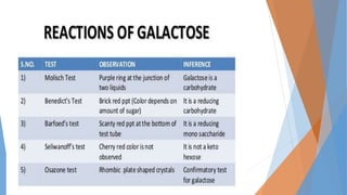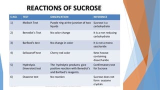 The document discusses various methods for analyzing carbohydrates, including qualitative and quantitative tests. It begins by classifying carbohydrates based on carbon atom count, terminal functional groups, number of sugar subunits, and other characteristics. Several common qualitative carbohydrate tests are then described in detail, including the Molisch test, Benedict's test, Barfoed's test, and others. The tests allow identification of carbohydrates by reaction color or formation of characteristic precipitates. The document also mentions quantitative carbohydrate analysis using liquid chromatography-mass spectrometry and biochemical testing specifically for glucose.