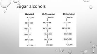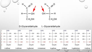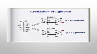 This document discusses the chemistry and functions of carbohydrates. It defines carbohydrates as polyhydroxy aldehydes or ketones and classifies them into monosaccharides, oligosaccharides, and polysaccharides. Monosaccharides include glucose, fructose, and galactose. The document discusses isomerism, mutarotation, epimers, and the reactions of monosaccharides. It describes the roles of carbohydrates as an energy source, precursor for other biomolecules, and structural component in cells. Key monosaccharides like glucose, fructose, and galactose and their importance are highlighted.