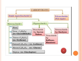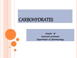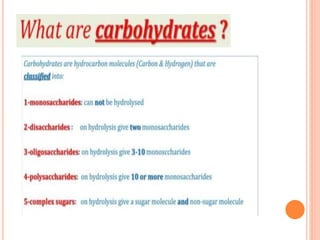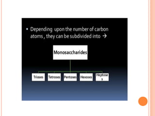Carbohydrates are widely distributed in plants and animals. They function primarily as a fuel in the body by liberating energy through oxidation. Certain carbohydrate products also promote further oxidation of foods and can be used as starting materials for other biological compounds. Chemically, carbohydrates contain carbon, hydrogen, and oxygen in proportions similar to water, with glucose having the formula C6H12O6. Carbohydrates can be classified based on the number of carbon atoms in their molecular structure, ranging from di- to heptoses.