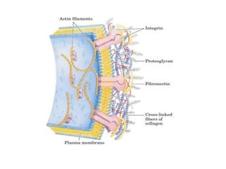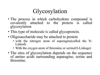 The document discusses carbohydrates and their roles in glycoproteins, glycolipids, and proteoglycans. It explains that carbohydrates are covalently attached to proteins or lipids through glycosylation to form these glycoconjugates. Glycosaminoglycans are linear polysaccharides that help form the extracellular matrix. Common examples discussed include hyaluronic acid, chondroitin sulfate, dermatan sulfate, heparan sulfate, and keratan sulfate. Proteoglycans are core proteins with attached glycosaminoglycan chains that interact with extracellular proteins. Glycoproteins have oligosaccharide chains attached to asparagine or serine/threonine residues. Gly