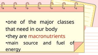 major classes that need in our body •they are macronutrients •main source and fuel of energy