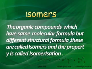 Carbon is a nonmetallic element that forms four covalent bonds. It exists in three isotopes, two of which are stable. Hydrocarbons contain only carbon and hydrogen. Saturated hydrocarbons have all single bonds between carbon atoms. Unsaturated hydrocarbons can add hydrogen through addition reactions with catalysts like palladium. Saturated hydrocarbons are generally inert but can undergo substitution reactions when exposed to chlorine or sunlight. Ethanol is a liquid at room temperature that is commonly known as alcohol and is used in drinks and medicines due to its solubility in water.