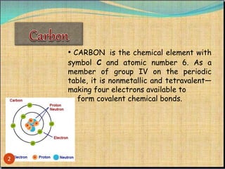 The document provides a comprehensive overview of carbon, its chemical structure, properties, and the types of covalent bonds formed, including examples with hydrogen, oxygen, and nitrogen. It also covers concepts in organic chemistry, such as hydrocarbons, isomerism, and functional groups, alongside their significance and differentiation between soaps and detergents. Additionally, it discusses carbon allotropes like graphite and diamond, and emphasizes the importance of understanding carbon compounds in various scientific applications.
