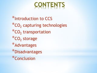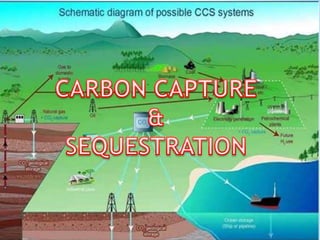 Carbon capture and storage (CCS) involves capturing CO2 emissions from large stationary sources like power plants, transporting it, and storing it away from the atmosphere. There are three main technologies for capturing CO2: post-combustion, pre-combustion, and oxy-fuel combustion. Transportation is usually via pipelines or ships. Storage options include injecting CO2 deep underground in geological formations like depleted oil and gas fields, or under the seafloor. CCS aims to reduce pollution and climate change impacts while enhancing oil recovery, though it is an expensive process with risks of leakage.