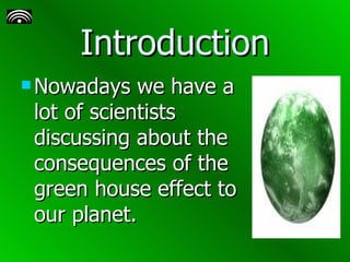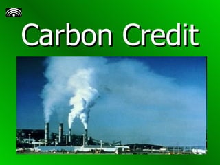 The document discusses carbon credits, which are a UN system that allows countries to trade units equivalent to 1 ton of CO2 emissions reduced. Developed countries that exceed emissions limits can cut emissions or buy carbon credits from developing countries to comply with the Kyoto Treaty, signed by 141 countries to reduce greenhouse gases by 5.2% by 2012.