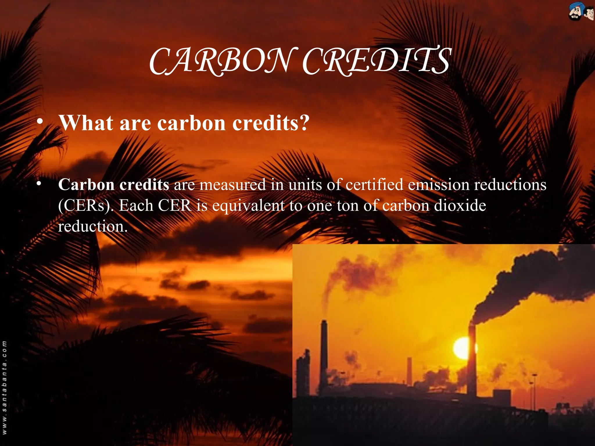 Carbon credits are certificates awarded for reducing greenhouse gas emissions. They are measured in units of carbon dioxide reduction and can be traded on exchanges. The Kyoto Protocol established a carbon trading system where countries must meet emission reduction targets or purchase credits from countries that have excess. The goal is to lower overall emissions of six greenhouse gases. While developed countries have mandatory targets, developing countries do not due to their historically low emissions per capita.