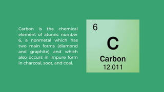 Carbon is a nonmetal element that is essential to life on Earth and is continuously cycled through the atmosphere, biosphere, oceans, and Earth's crust. It forms the basis of all living organisms and is a key component in regulating the planet's climate. The carbon cycle describes how carbon continuously moves between the atmosphere, living things, oceans, and Earth's crust through natural processes like respiration, photosynthesis, and volcanic eruptions. However, human activities like burning fossil fuels have increased the amount of carbon dioxide in the atmosphere, disrupting the natural carbon cycle and causing climate change.
