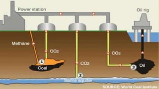 The document discusses carbon dioxide (CO2), its properties, and the processes involved in carbon capture and storage (CCS). It covers the methods for capturing, transporting, and storing CO2, as well as its various uses in industries such as food processing, beverage carbonation, and enhanced oil recovery. It also highlights the advantages and disadvantages of CCS as a solution for reducing atmospheric pollution and combating climate change.