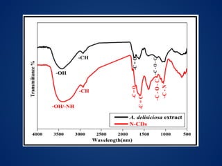 This document discusses carbon dots (CDs), which are small carbon nanoparticles less than 10nm in size with surface passivation. CDs were discovered in 2004 and have since been studied for their fluorescent properties. They are biocompatible and photostable. The document discusses methods for synthesizing CDs and characterizing their properties with techniques like UV-Vis, fluorescence, TEM, and Raman spectroscopy. It also discusses applications of CDs in areas like bioimaging, optronics, catalysis, drug delivery, and biosensing. Specifically, it notes CDs are being studied for optical imaging applications and targeting cancer cells.