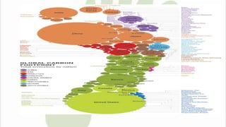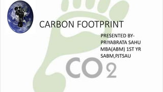 This document discusses carbon footprints and provides examples of carbon footprints for various activities. It defines a carbon footprint as a measure of the total greenhouse gases emitted due to a population, system or activity. It explains that carbon footprints are calculated based on carbon dioxide, methane and other greenhouse gas emissions. The document then gives examples of the carbon footprints of activities like web searching, traveling by different modes of transportation, and estimates the average carbon footprint per person globally and in India. Finally, it outlines some impacts of large carbon footprints and provides tips for reducing individual carbon footprints.