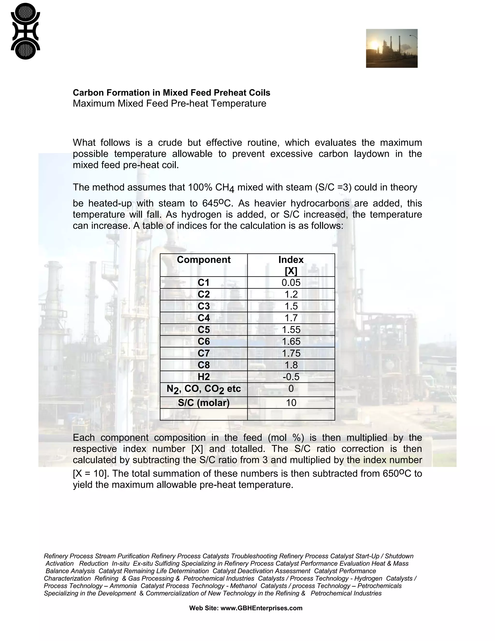 The document provides an engineering design guide from GBH Enterprises on preventing carbon formation in mixed feed preheat coils, emphasizing the importance of calculating maximum allowable pre-heat temperatures based on feed composition. It details the calculation method using component indices and s/c ratios, illustrating two examples with natural gas and LPG compositions. The publication includes a disclaimer regarding the accuracy of the information and liability.