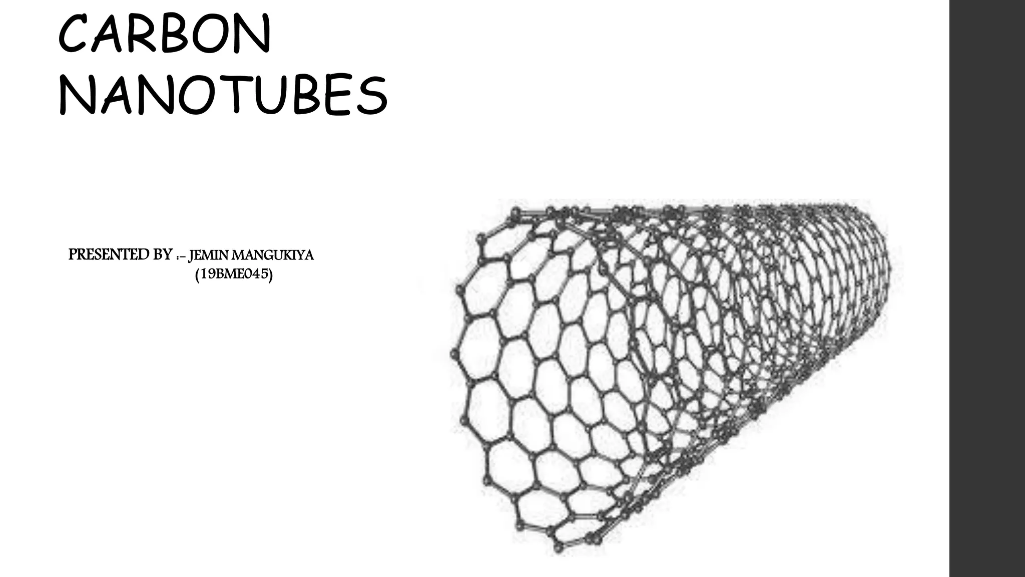 This document discusses carbon nanotubes (CNTs). It defines CNTs as cylindrical molecules consisting of rolled up sheets of single-layer carbon atoms. There are two main types: single-walled carbon nanotubes (SWCNTs) and multi-walled carbon nanotubes (MWCNTs). CNTs have extraordinary properties including high tensile strength, thermal conductivity better than diamond, high aspect ratio, and chemical stability. Potential applications discussed include use in structural reinforcement materials, conductive polymers, field emission displays, energy storage, biomedical devices like drug delivery systems, air and water filtration, solar cells, and hydrogen storage.