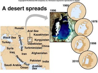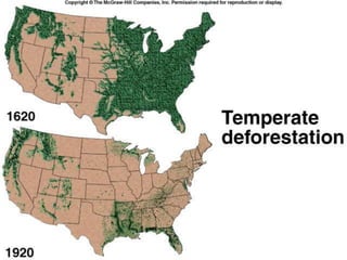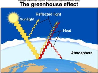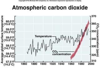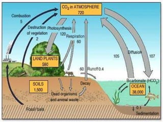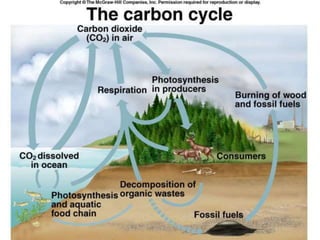 The carbon and oxygen cycles describe the movement of carbon and oxygen between the biosphere, atmosphere, and hydrosphere. Carbon dioxide is absorbed by plants through photosynthesis and released through respiration, while oxygen is a byproduct of photosynthesis and used in respiration. Human activities like burning fossil fuels have increased atmospheric carbon dioxide levels, contributing to the greenhouse effect and global warming. This disrupts global climate patterns and ecosystems.