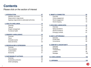 This document discusses trends in the carbonated soft drinks category. It covers 9 key trends: health and wellness, sensory and indulgence, individualism and expression, sustainability and ethics, smart and connected, evolving landscapes, easy and affordable, comfort and uncertainty, and conclusions. For the health and wellness trend, it notes consumers are increasingly seeking out "natural" products and avoiding artificial ingredients, representing an opportunity for more natural soft drinks.