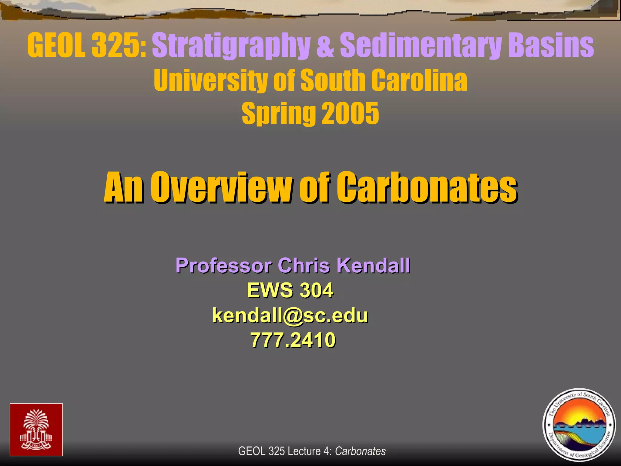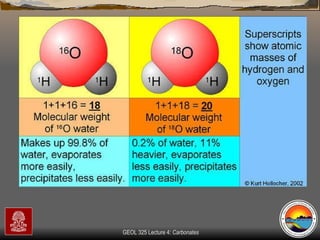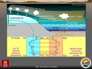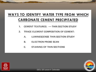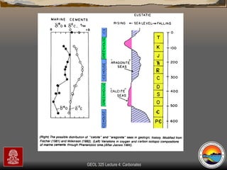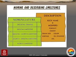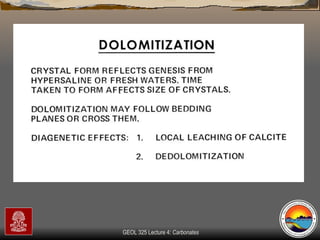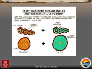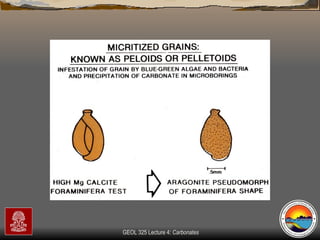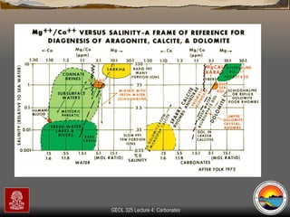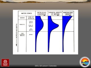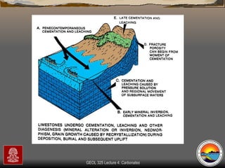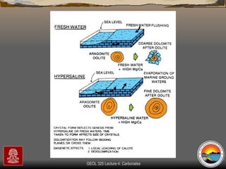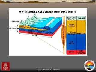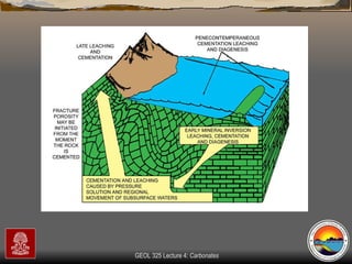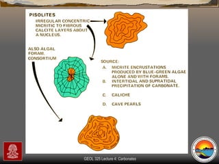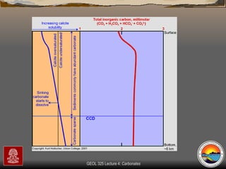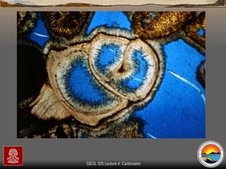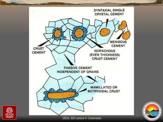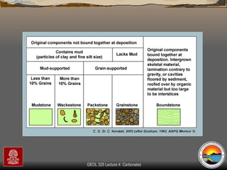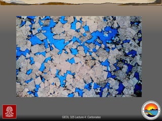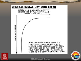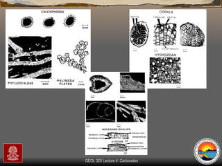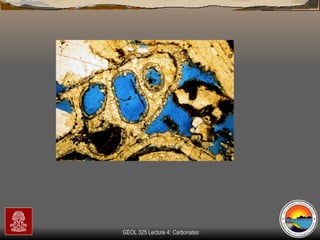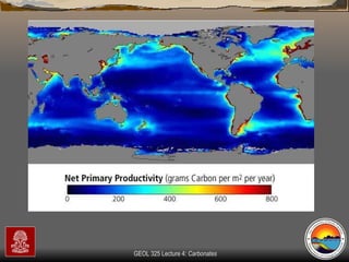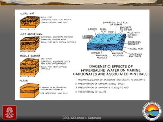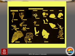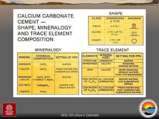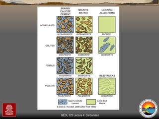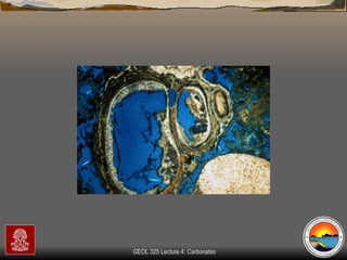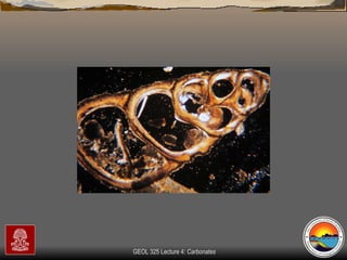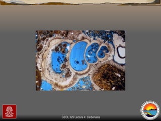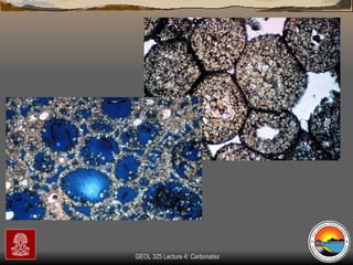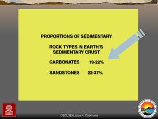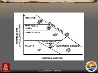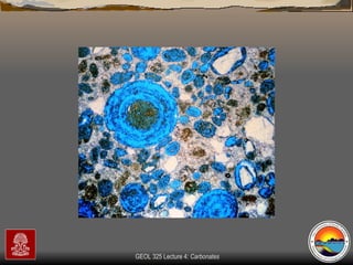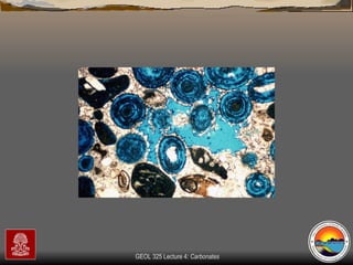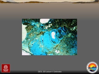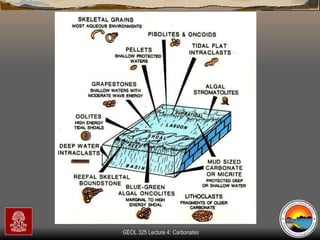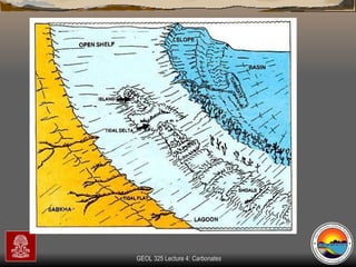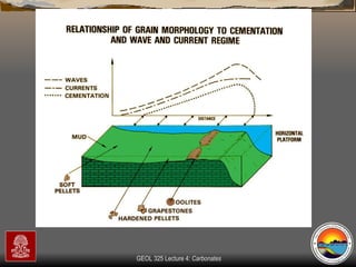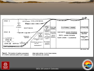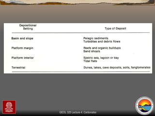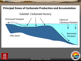 The document provides an overview of a course on carbonates and sedimentary basins. It discusses how carbonate sediments form in different depositional environments and the factors controlling carbonate accumulation and distribution. It also summarizes the key components and textures of carbonate rocks and the processes of diagenesis.