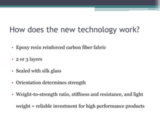 Carbon fiber is a strong yet lightweight material made of thin strands of carbon atoms bonded together in a polymer resin. It is made by pulling carbon fibers through epoxy resin and sealing with silk glass. The orientation of the fibers determines the strength. Researchers are working to lower the cost to make carbon fiber more accessible for clean energy technologies. Carbon fiber has many applications due to its high strength to weight ratio and resistance to heat.
