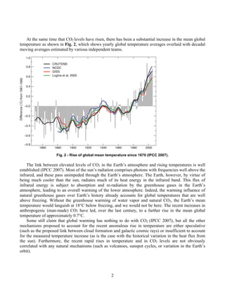 2. Current carbon dioxide levels in the atmosphere are the highest they have been in at least 800,000 years, and global temperatures have risen about 0.7°C over the past century due to increased CO2 and other greenhouse gases from human activity. Further increases in CO2 emissions are expected to cause more global warming and changes in climate with serious environmental and economic effects.
