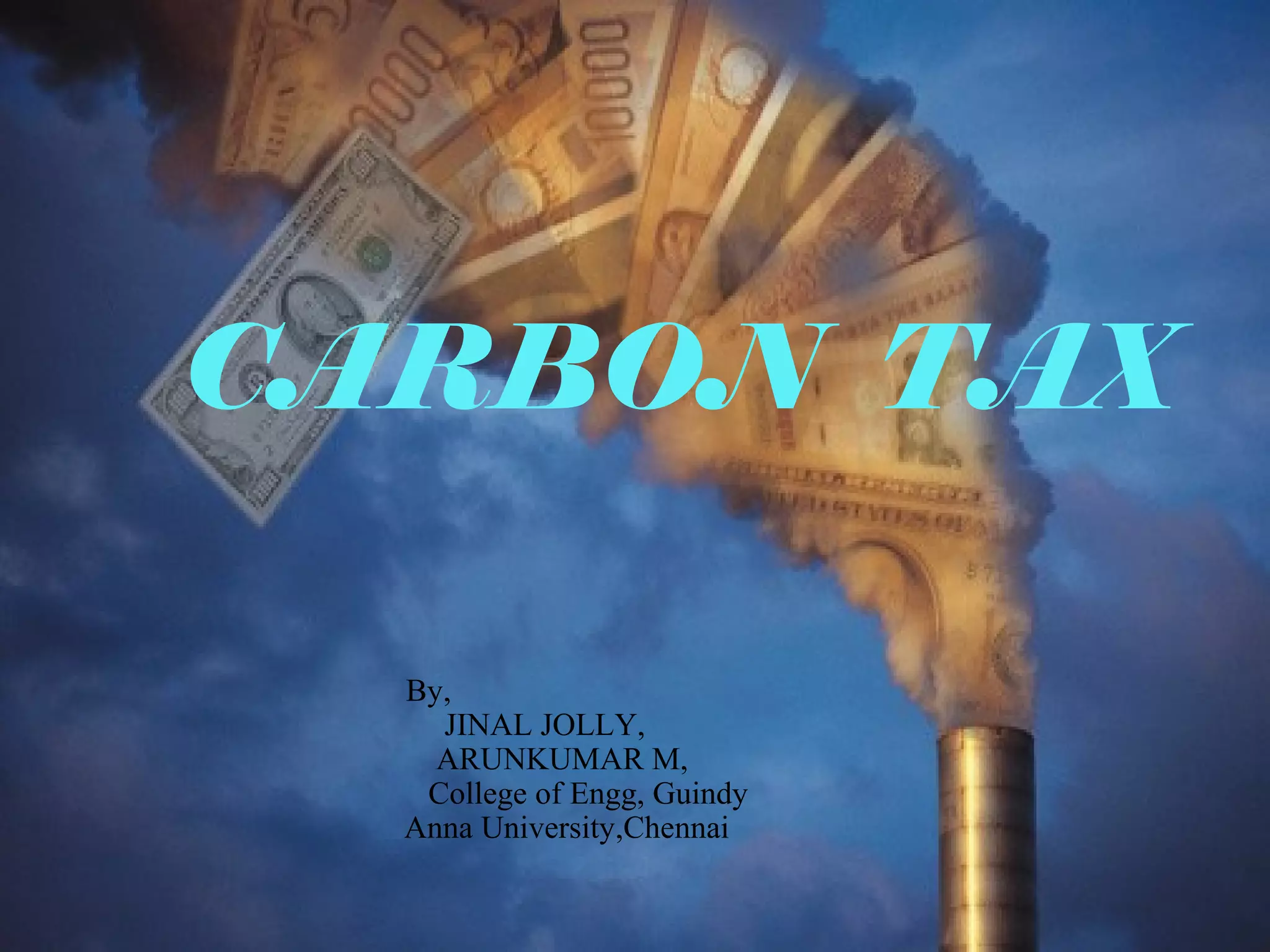 The document discusses carbon tax, which is a tax placed on carbon dioxide emissions from the use of fossil fuels. It aims to reduce CO2 emissions and protect the environment by making carbon-intensive activities more expensive. While a carbon tax has advantages like economic growth and emission reductions, there are also disadvantages like increased costs for companies and the poor. Only a few countries have implemented carbon taxes successfully so far. The document concludes that a carbon tax is important for environmental sustainability but will be challenging to implement in India due to economic priorities.
