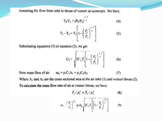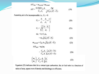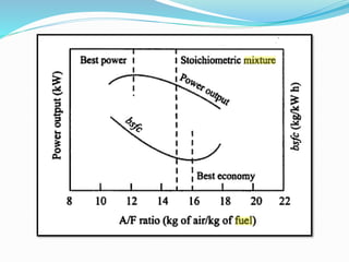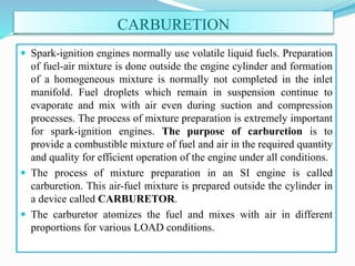 This document provides an overview of carburetion in spark-ignition engines. It discusses how a carburetor works to prepare a combustible air-fuel mixture for the engine cylinders. The key components of a carburetor are described, including the venturi tube, float chamber, jets, and choke. The document also covers the different air-fuel mixture requirements for idling, cruising, and high power operations and how the carburetor supplies the appropriate mixture for different engine conditions. Overall, the carburetor is a device that atomizes fuel and mixes it with air in varying proportions to provide the engine cylinders with a combustible air-fuel mixture for operation under all load conditions and speeds.