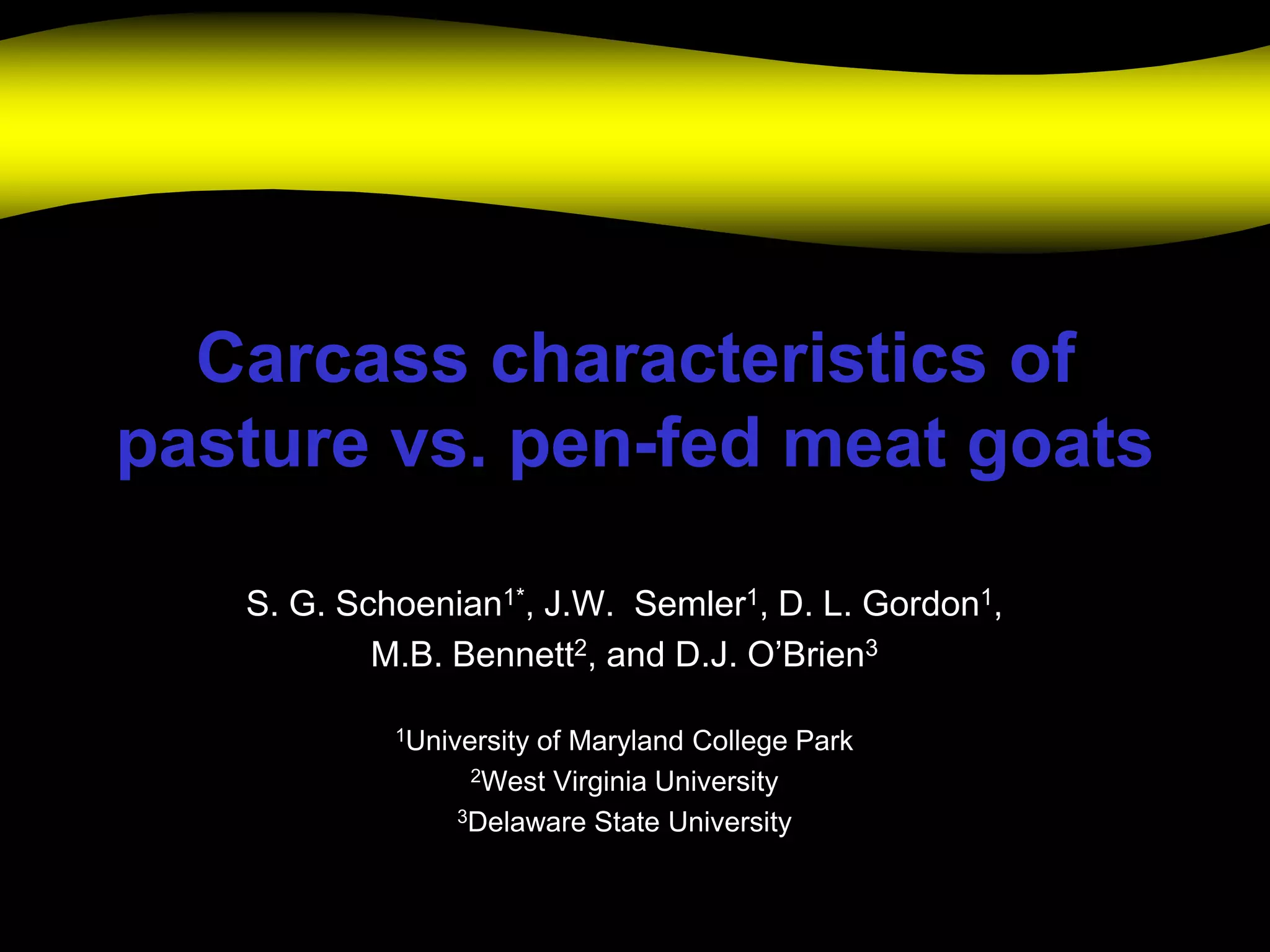 This study compares the carcass characteristics of pasture-raised versus pen-fed meat goats, finding that pen-feeding generally yields better carcass outcomes, including higher dressing percentage and rib eye area. Over a 112-day feeding period, data indicated significant differences in weights and fat content between the two groups. A more comprehensive investigation is planned for 2012 to further assess the economic viability and performance differences in these feeding systems.