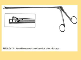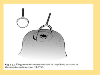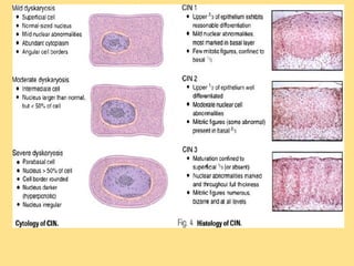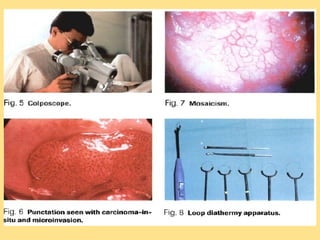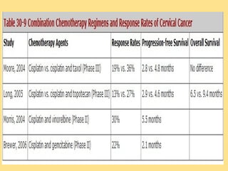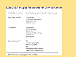 This document discusses cervical cancer, including its epidemiology, risk factors, mechanisms, evaluation, staging, treatment options, and prognosis. Key points include: