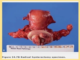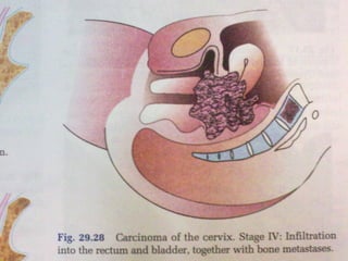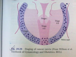 - Staging follows the FIGO system and determines prognosis and treatment. Surgery (e.g. radical hysterectomy), radiotherapy, and chemotherapy are common treatment options.