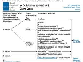 Gastric carcinoma is the major cause of mortality worldwide. It is more common in males than females and incidence peaks between 50-70 years of age. Risk factors include H. pylori infection, smoking, low socioeconomic status, and family history. Histologically, adenocarcinoma accounts for 90% of cases. Early detection is key to improving outcomes, as resection surgery can potentially cure localized disease, but prognosis is generally poor.