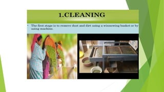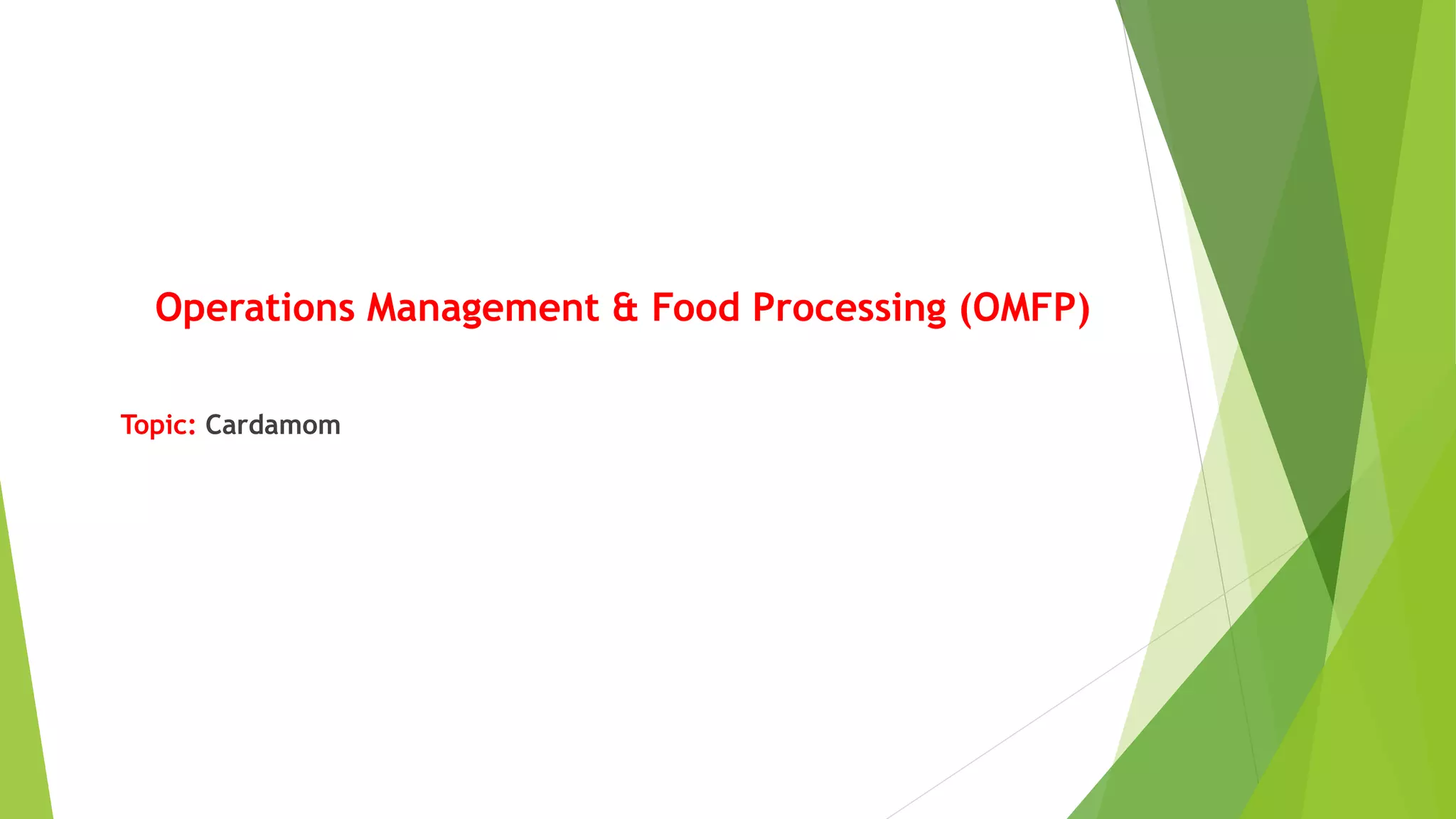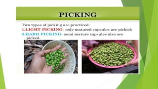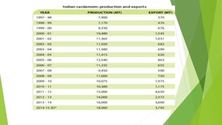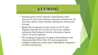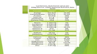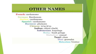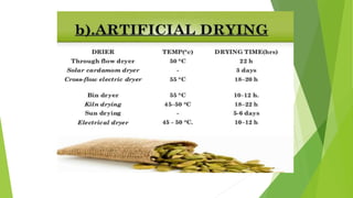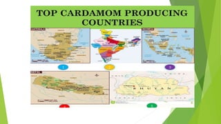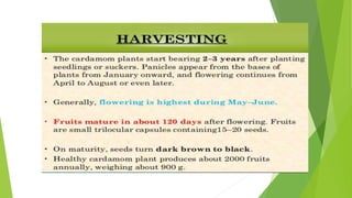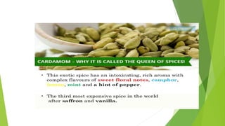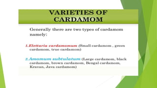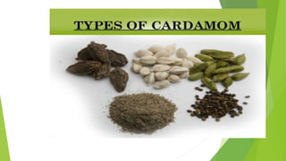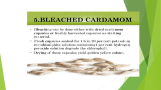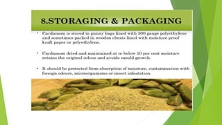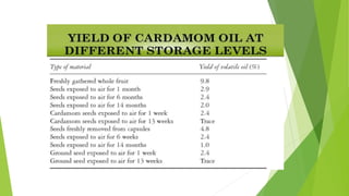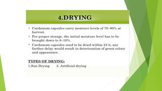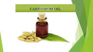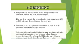Cardamom processing involves crushing the fruits to produce cardamom oil and oleoresin, which are used as alternatives to the whole spice for flavoring various processed foods, condiments, beverages, tobacco, and in cosmetics like soaps and lotions. The oil and oleoresin extracted from crushed cardamom fruits are mainly used as substitutes for ground cardamom in flavoring a wide range of processed, frozen, and pre-packaged foods as well as beverages.