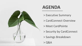 This document summarizes a payment processing company called CardConnect. It outlines their focus on simple, secure and PCI compliant payment solutions. They provide a powerful platform that includes real-time reporting and next-day funding. Their solutions include patented tokenization and point-to-point encryption for security, as well as business intelligence reporting and interchange management to lower costs. They support over 70,000 organizations in processing billions of dollars in transactions each year.