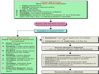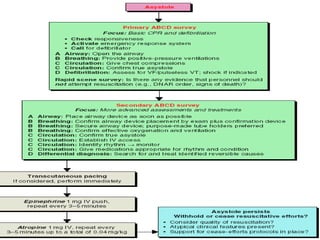 This document provides information on cardiopulmonary resuscitation (CPR) including the patterns of cardiac arrest, causes of reversible cardiac arrest, the primary and secondary surveys of CPR, and treatments for different cardiac rhythms encountered during resuscitation such as asystole, bradycardia, and pulseless electrical activity. It details the steps for opening the airway, providing ventilation, performing chest compressions, and defibrillation. It also outlines advanced life support interventions including intubation, intravenous access, defibrillation, and medications for specific rhythms.