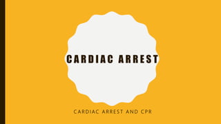 Cardiac arrest is defined as the abrupt loss of cardiac function and can result from ventricular fibrillation, pulseless ventricular tachycardia, asystole, or pulseless electrical activity. Management involves cardiopulmonary resuscitation (CPR) including chest compressions, ventilation, and defibrillation if indicated. The chain of survival links immediate recognition, early CPR, rapid defibrillation if needed, advanced life support, and post-cardiac arrest care. Basic life support involves chest compressions, airway management, rescue breathing, and public access defibrillation with an automated external defibrillator if available. Advanced life support adds establishment of intravenous access, rhythm monitoring/defibrillation, and administration