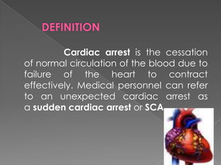 Cardiac arrest occurs when the heart suddenly stops beating effectively due to failure of electrical signaling or pumping function, preventing blood from circulating to vital organs, and CPR involves chest compressions and rescue breaths to manually circulate blood to the brain and heart until spontaneous circulation can be restored through defibrillation or other medical treatment. The document provides details on causes, diagnosis, treatment including the steps of CPR, and outcomes of cardiac arrest.