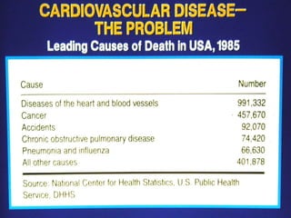 The document discusses cardiovascular disease and cardiopulmonary resuscitation (CPR). It states that cardiovascular disease is the leading cause of death worldwide, with over 50% of deaths due to cardiovascular issues. It also notes that CPR training can help save lives by intervening in cases of heart attack, stroke, or choking. The CPR training program covered in the document teaches techniques for adults, children, and infants, including demonstrations of CPR, the Heimlich maneuver, and first aid basics.