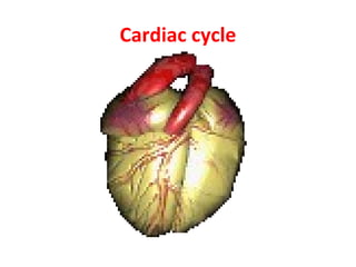 The cardiac cycle describes the repeating sequence of events in the heart during one heartbeat. It begins with atrial systole which fills the ventricles with blood. This is followed by ventricular systole where the ventricles contract and eject blood out of the heart. The cardiac cycle is regulated by the heart's conduction system which coordinates the contractions of the atria and ventricles. It ensures the atria contract before the ventricles so blood is pumped efficiently through the heart and circulatory system with each heartbeat.