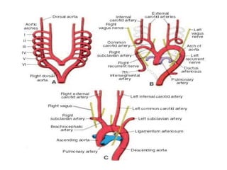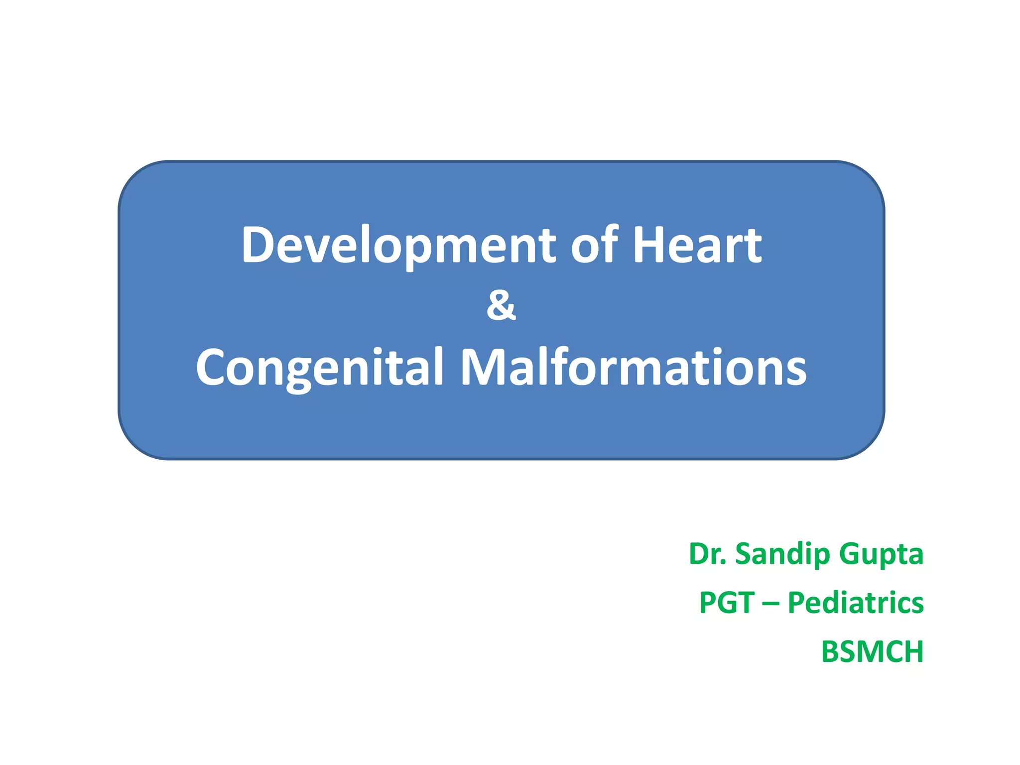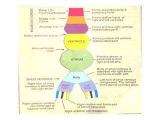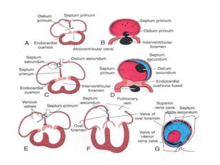 The heart develops from cardiogenic mesoderm and forms endothelial heart tubes that fuse to create a single heart tube located within the pericardial cavity. The heart tube undergoes looping to form the basic chambers and portions. Septae then develop to divide the heart into four chambers - the interatrial septum divides the atria while the interventricular and aorticopulmonary septa divide the ventricles. Various congenital malformations can occur if septation is incomplete or unequal. The great arteries also septate during development.