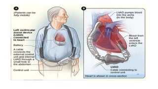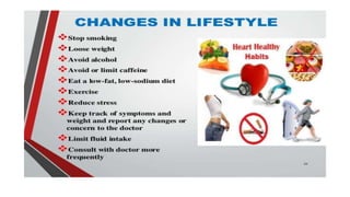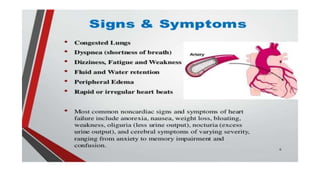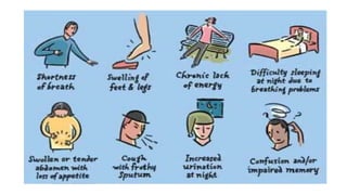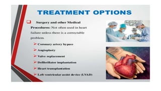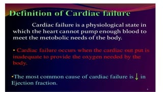 Cardiac failure can be caused by coronary artery disease, cardiomyopathy, hypertension, valve disease, acute illness, diabetes, congenital heart disease, alcohol consumption, smoking, family history, hemorrhage and surgery, pulmonary embolism, excessive sodium intake, and physical or emotional stress. Diagnosis involves echocardiograms, electrocardiograms, and chest x-rays. Nursing diagnoses include decreased cardiac output, excess fluid volume, impaired gas exchange, risk for activity intolerance, and risk of anxiety. Nursing interventions focus on monitoring for edema, distention, and pain; following diet and fluid restrictions; checking vital signs; encouraging breathing exercises; monitoring skin; limiting activity; and providing a calm environment.