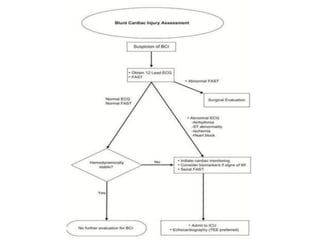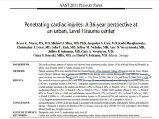 The document discusses the historical context, incidence, and management of cardiac injuries, emphasizing the evolution of surgical techniques since antiquity. It presents statistical data on types of cardiac injuries, treatment protocols, and the necessity for immediate surgical intervention in cases of severe trauma. Additionally, it highlights the importance of diagnostic procedures like echocardiography and the preferred surgical approaches to optimize patient outcomes.